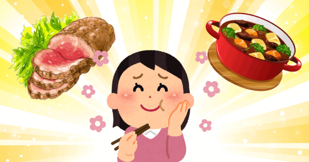 ビーフシチューのお肉はスプーンで触れるだけでほろりと崩れるほど柔らかく、ローストビーフはまさに、口の中でとろけてなくなってしまいました。両方とも上質なお肉ならではの甘さが口いっぱいに広がり、あまりの美味しさに、ほっぺたが痛くなるほどでした(笑)