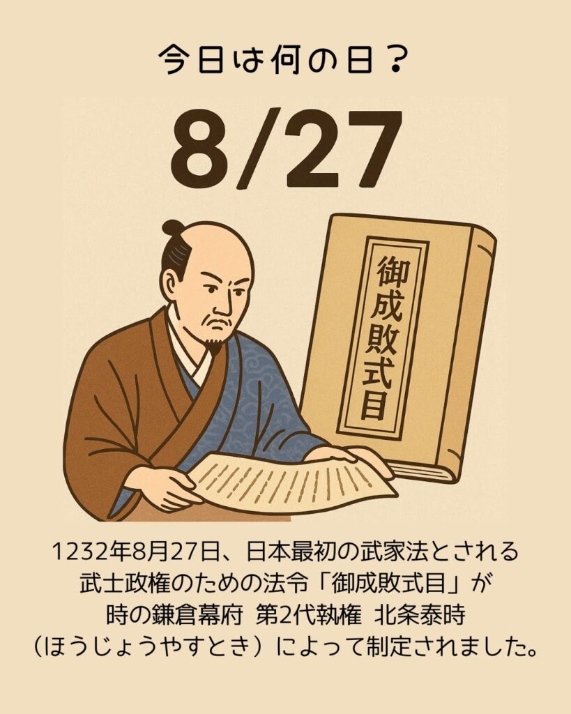 1232年8月27日、鎌倉幕府の執権・北条泰時によって「御成敗式目(貞永式目)」が制定されました。