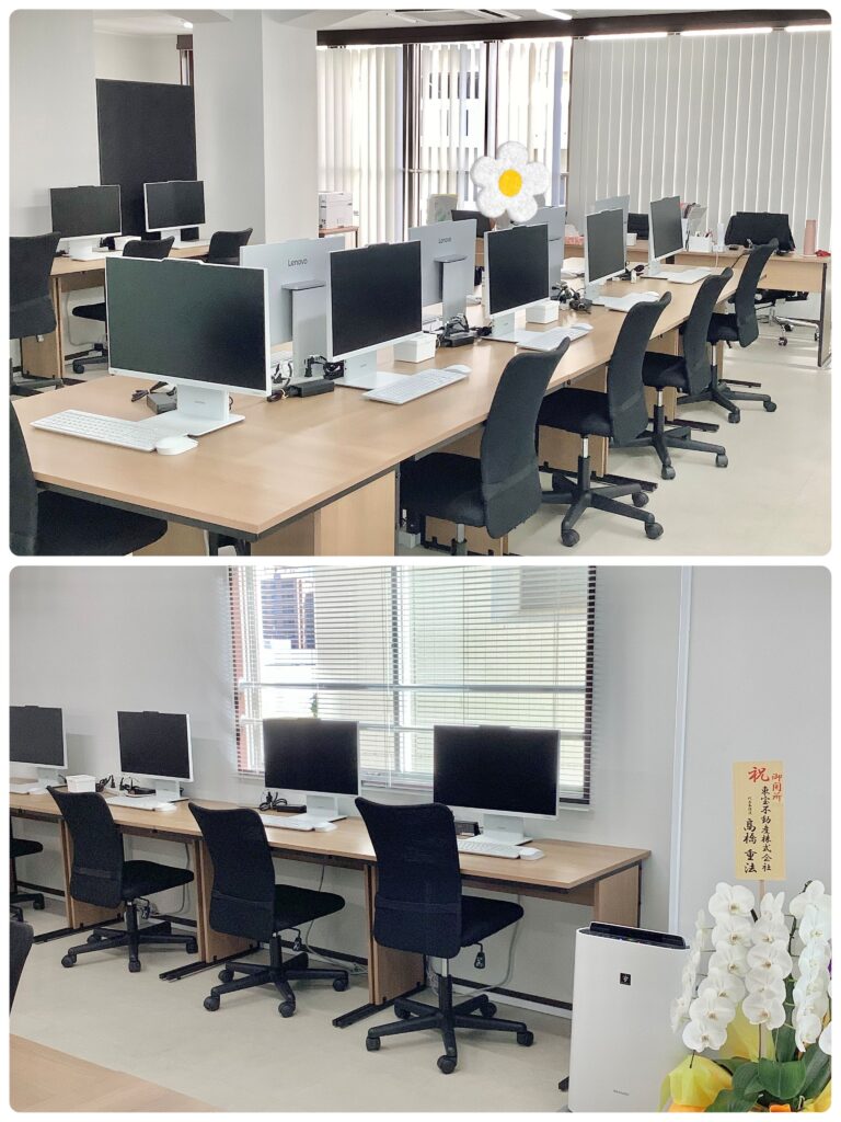 オフィスエリアは大きなパソコンが20台、ゆったりと並んでいます。