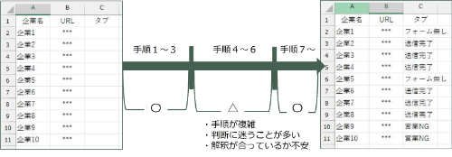 ⑤送信可能なフォームか確認 ⑥定型文を貼り付けて送信 ⑦結果をシートに記入