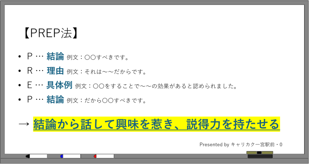 以前、プレゼンのコツとして「PREP法」をご紹介しました(下記リンク参照)。
