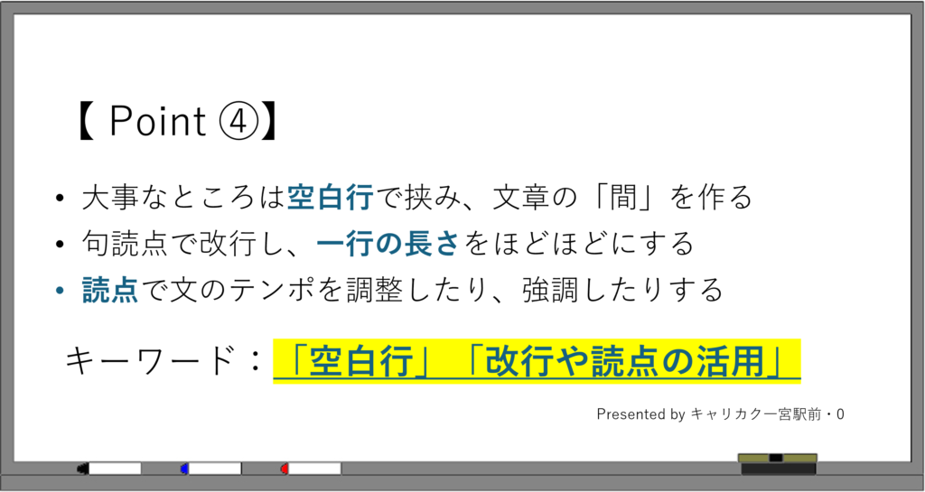 レポートや論文などのお堅くギチギチに文字が詰まった文章では使いづらい手法ですが、