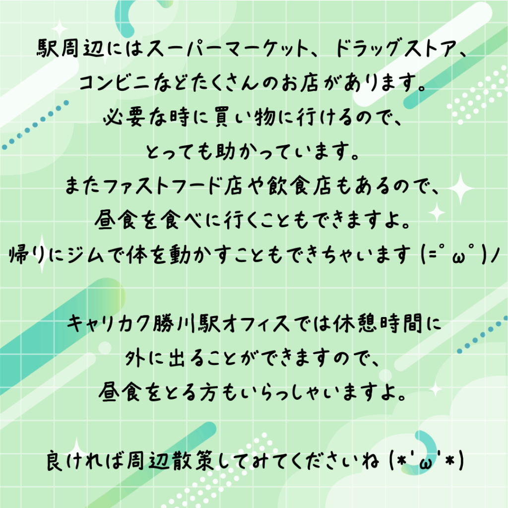 結構皆さん、職員もそうですが、ご飯屋さんも多いのでお昼に買いに行ったり食べに行くという方が結構多くいらっしゃいます!