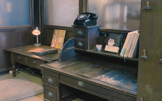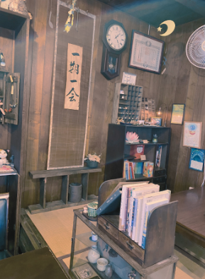 店内に足を踏み入れると、古民家ならではの趣のある空間が広がっています。飲食スペースは畳の座席で、リラックスできる和の雰囲気が漂っています。黒電話が置かれたテーブルや掛け軸、そして古びたミシン台など、店内の細部にまでこだわりが感じられ、どこを見ても懐かしさと温かみを感じます。
