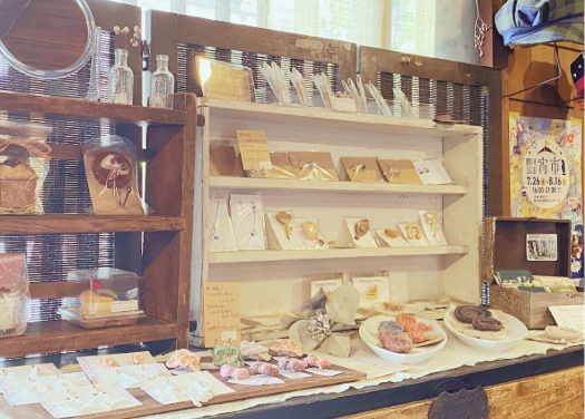 1階の飲食スペースの隣には、手作りのアクセサリーや小物が販売されているコーナーも。可愛らしい小さなパフェのイヤリングや和柄のポーチ、クルミボタンなど。さまざまな作品が並んでいました。