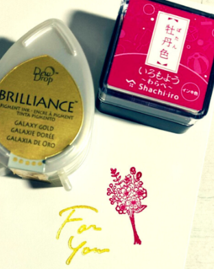 ガラスペンや万年筆、メモパッドやいろいろなインクやペンを見せてもらった結果、牡丹色と金のスタンプインクを2つ購入。