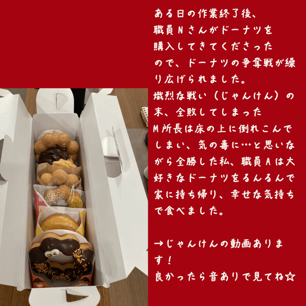 先日、職員Nさんがドーナツを買ってきてくださり、職員みんなで分け合いました(*’▽’)🎵
