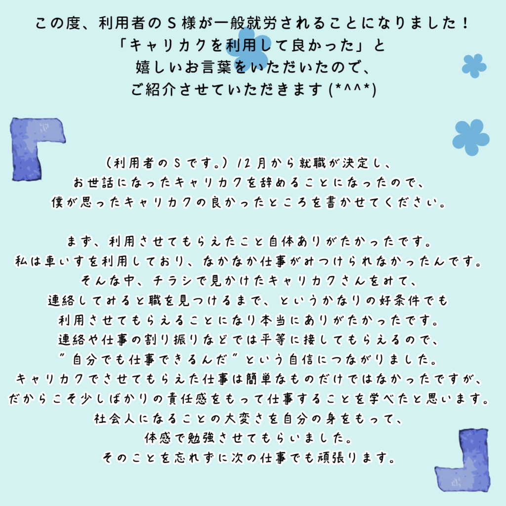 この度利用者さんのS様がご就職が決定したのでご報告致します(*^^*)🎵