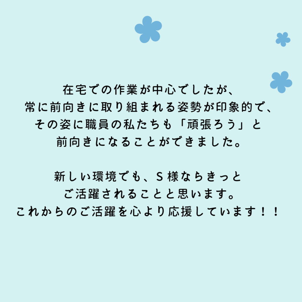 在宅勤務がほとんどで、通所されることは中々なかったですが、通所されているときは常にお仕事に向き合って頑張っていました。
