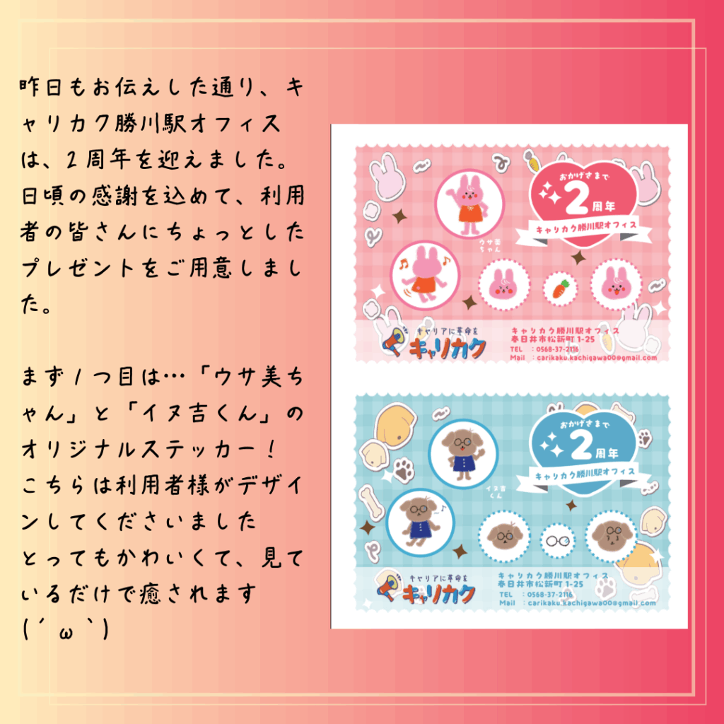昨日もお伝えした通りキャリカク勝川駅オフィスは11月1日で2周年を迎えました。