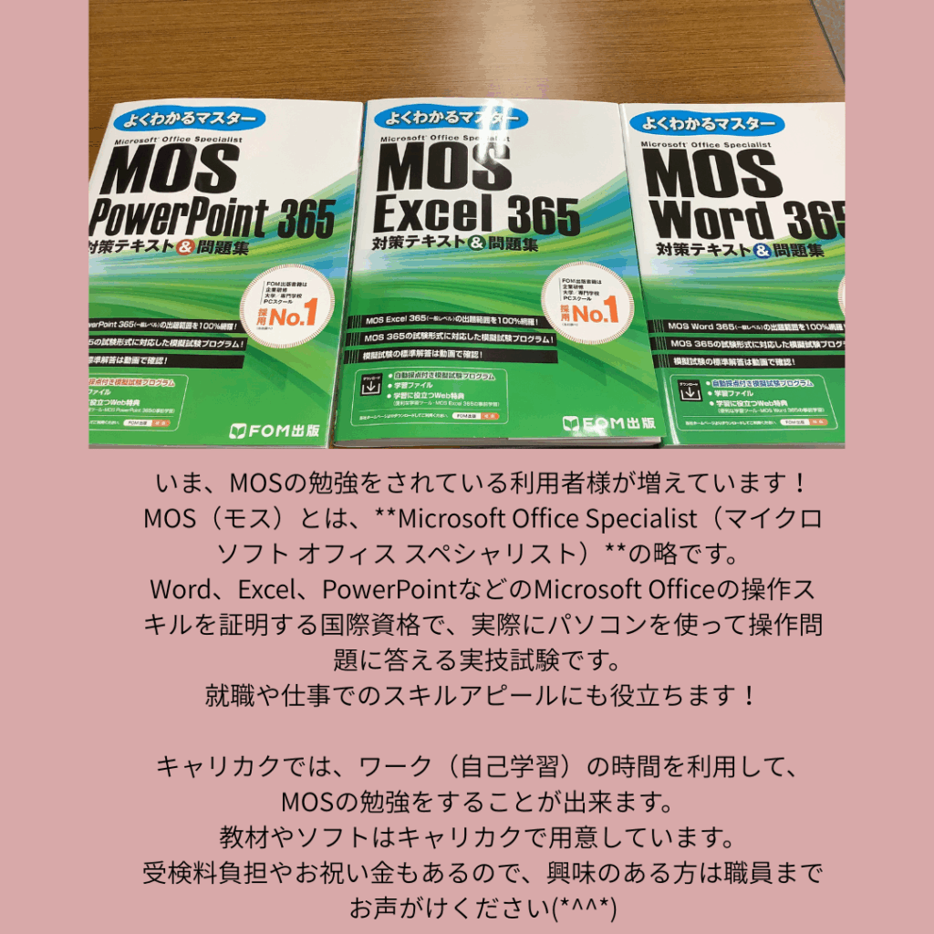 私も今ワークの時間にMOSの勉強をしています( *´艸`)