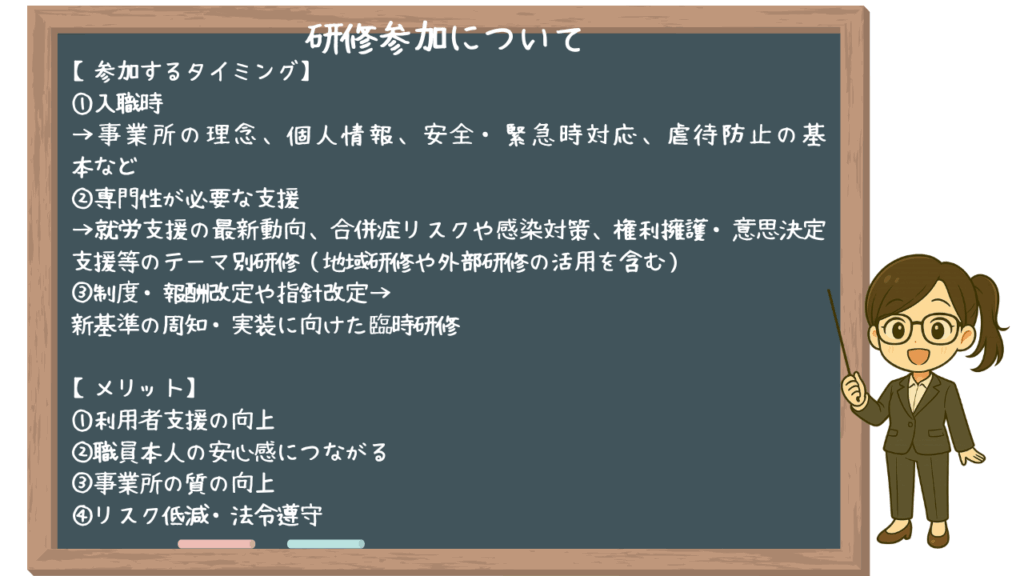 研修に参加するというのは、自分の知識を増やすことにも繋がりますが、それ以外にも利用者さんへのサービスの質の向上にもつながります。