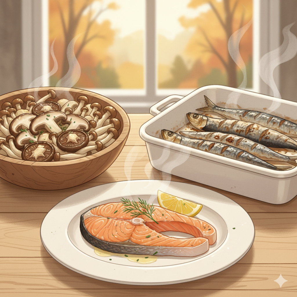 ビタミンDは、食品から手軽に摂取することができます。鮭やイワシなどの魚類、きくらげやしめじなどのきのこ類に豊富に含まれているので、これらの食材を意識して食事に取り入れてみてください。