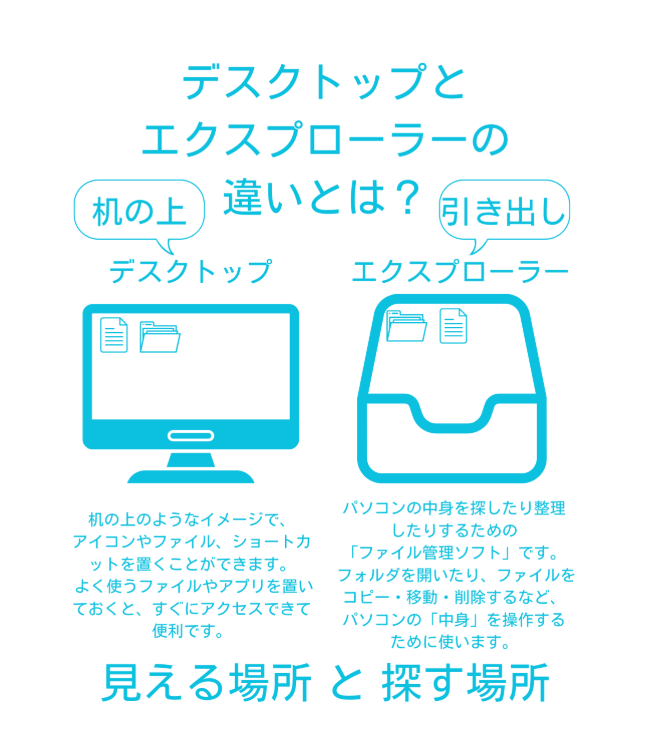 デスクトップは見える場所に置く感覚、エクスプローラーはパソコン全体を見渡すためのツール。