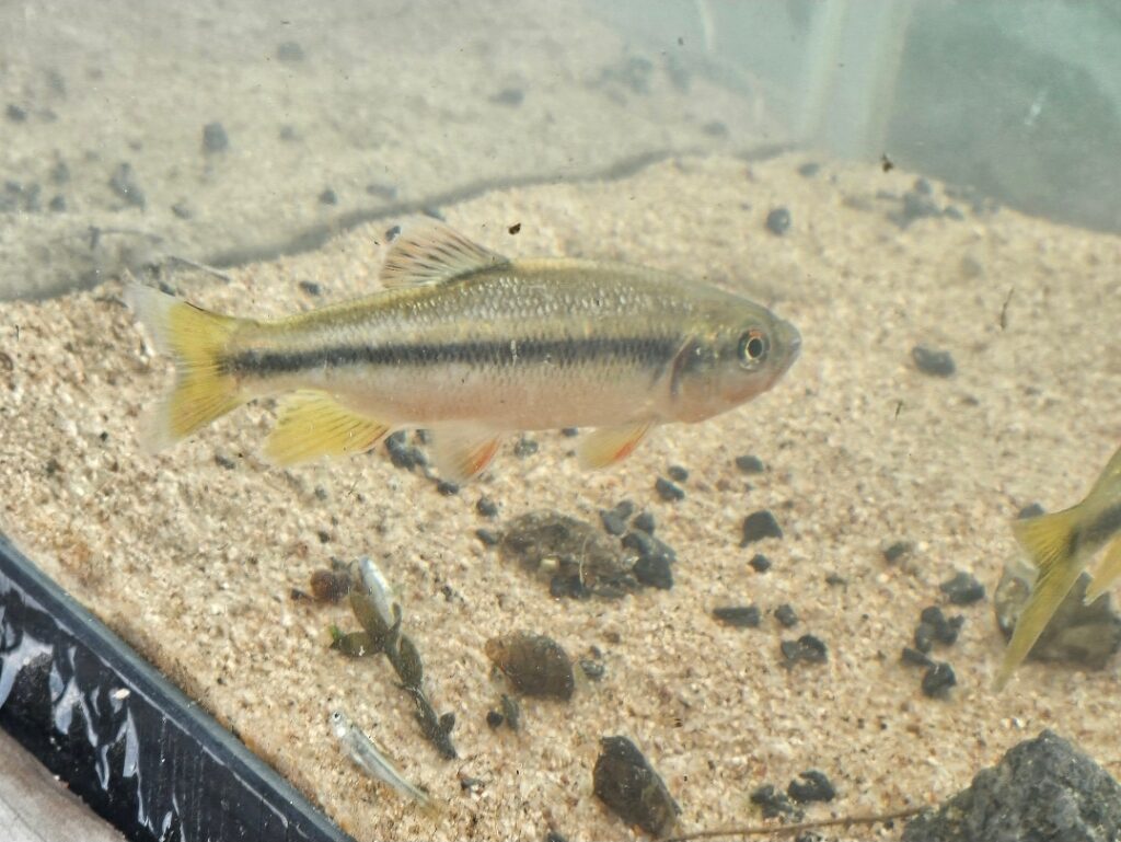 この細長い魚はカワムツという、種類でコイの仲間の魚です。オスは繁殖期になるとお腹は婚姻色で鮮やかな赤色になります。この種類が最も多かったですね。