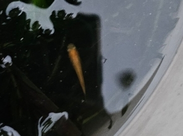 たくさんの自然な魚がいる中、黄色の小さな姿が、ヒメダカです。本来は用水路にいない魚です。   だけど、だれかが逃がしてここに流れついちゃったのかな?別のメダカの鉢へ入れました。