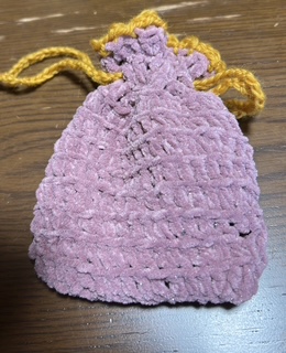 黄色の紐がチャームポイントの巾着袋を編みました。